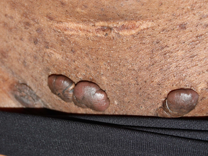The clinical presentation of pubic keloids is somewhat variable. As depicted in the following images, pubic keloids always start as a small papule that can grow over time. Among Asian/Caucasian women, pubic keloids usually remain small and very limited in number. Among African/African American women, however, the primary pubic keloids can become tumoral and expand in size. The worse cases of pubic keloids are seen in women who undergone keloid removal surgery.